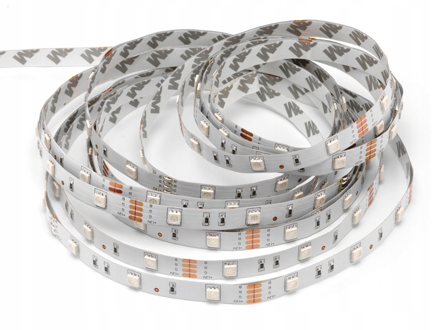 - Taśma LED na której są zamontowane diody typu RGB czyli świecące trzema podstawowymi kolorami: czerwonym, zielonym i niebieskim, za pomocą kontrolera możemy włączać każdy z tych kolorów oraz zmieniać je w dowolnym momencie. Najciekawsze jest mieszanie się kolorów podstawowych przez co otrzymujemy praktycznie nieskończenie wiele innych kolorów (ilość kolorów zależy od podłączonego kontrolera oraz od programów jakie on obsługuje przez co przy odpowiednim kontrolerze możemy uzyskać każdy kolor świecenia a różne programy kontrolera będą posiadały bardzo widowiskowe przejścia między kolorami oraz zmiany kolorów.