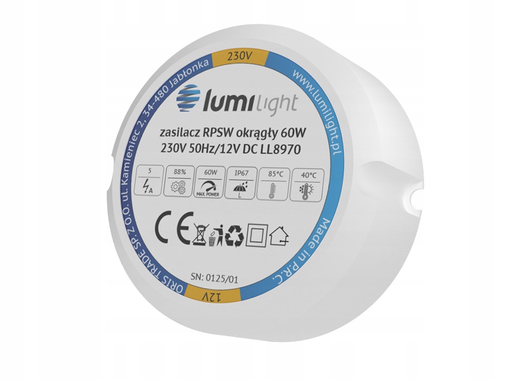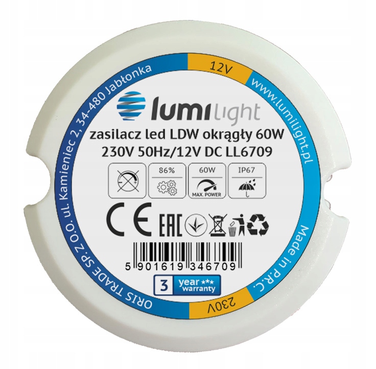 Zasilacz montażowy PREMIUM fi60 do puszki 12V 5A 60W LED IP67 dopuszkowy
