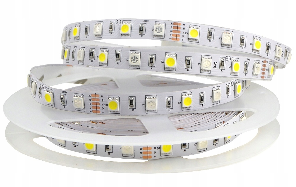 - Taśma led typu RGB + WW/CW to ulepszona taśma zwykła wielokolorowa rgb, na której można uzyskać barwę czystą białą ciepła i białą zimną. Na zwykłej taśmie rgb nie da sie uzyskać w ogóle barwy ciepłej a barwę zimną uzyskuje się poprzez mieszanie barw red, green, blue przez co barwa zimna nie jest klarowna wpada w niebiesko-fioletowy kolor. Taśma RGBW zbudowana jest z 150 diod RGB i 150 diod w kolorze białym (ciepłym lub zimnym). Diody montowane są na zmianę.