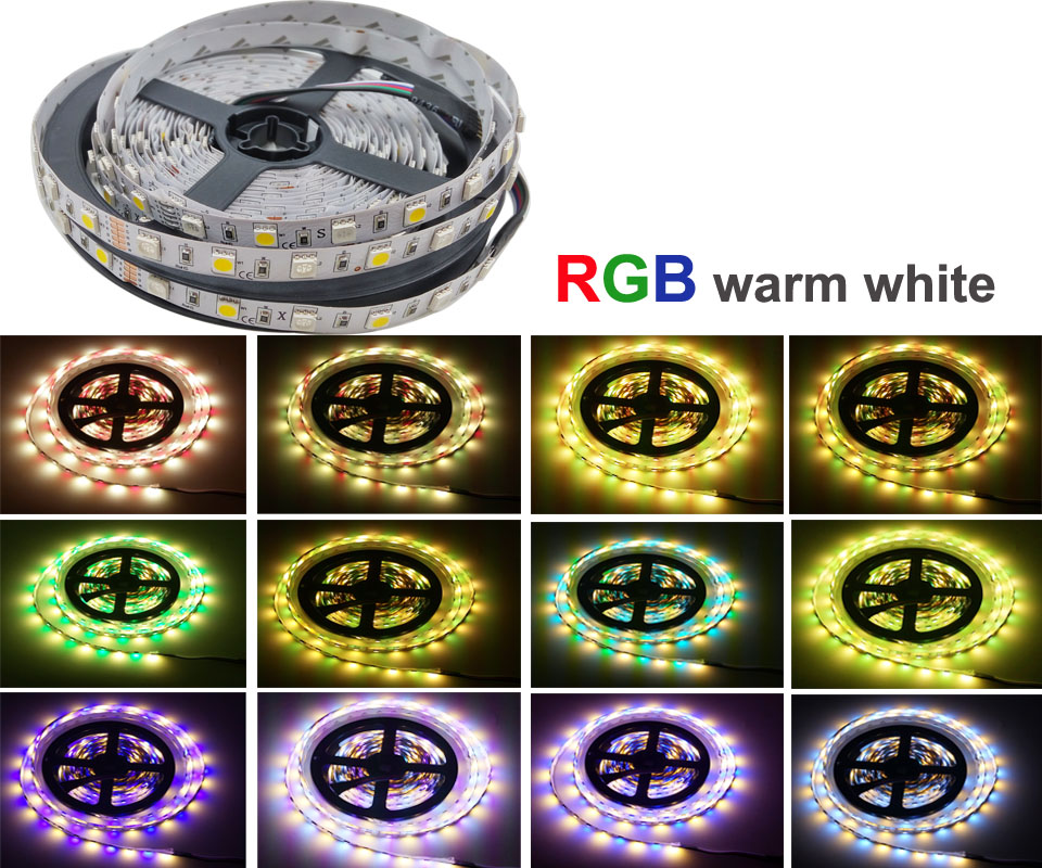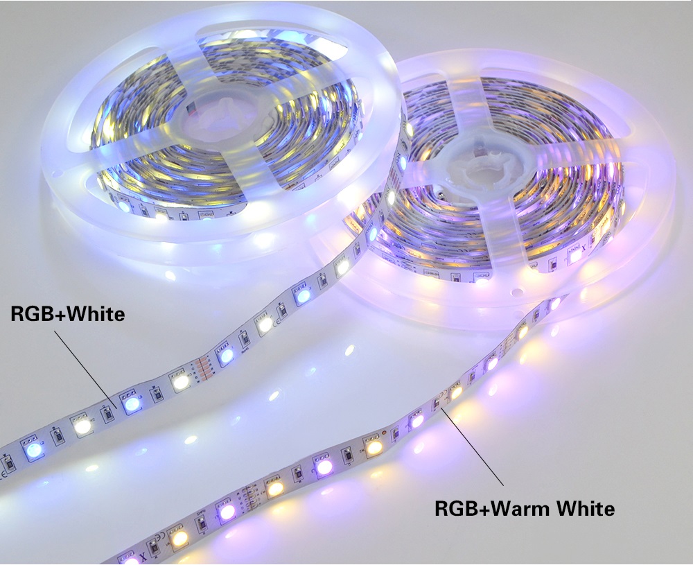 - Taśma led typu RGB + WW/CW to ulepszona taśma zwykła wielokolorowa rgb, na której można uzyskać barwę czystą białą ciepła i białą zimną. Na zwykłej taśmie rgb nie da sie uzyskać w ogóle barwy ciepłej a barwę zimną uzyskuje się poprzez mieszanie barw red, green, blue przez co barwa zimna nie jest klarowna wpada w niebiesko-fioletowy kolor. Taśma RGBW zbudowana jest z 150 diod RGB i 150 diod w kolorze białym (ciepłym lub zimnym). Diody montowane są na zmianę.