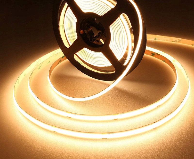 Taśma LED COB to specjalistyczny pasek LED, który zapewnia niewiarygodnie gładkie światło, pozbawione poszczególnych punktów świetlnych. Wykorzystując taśmę LED COB, nie musisz stosować profilu z mlecznym kloszem, aby uzyskać jednolitą linię światła, bez pojedynczych punktów LED. Taśma LED COB charakteryzuje się elastycznością i wszechstronnym zastosowaniem. Będziemy mogli ją wykorzystać do oświetlenia wszelakiego rodzaju wnętrz, a wysoki współczynnik oddawania barw CRI>85 Ra połączony z niezwykłą wydajnością gwarantuje wysokiej jakości oświetlenie o naturalnym charakterze. Wykorzystując taśmy LED oparte na technologii diod COB, dzięki dużemu zagęszczeniu chipów na metrze uświadczymy efekt pełnej (jednolitej) linii świetlnej. Uciążliwe dla wielu posiadaczy LED-ów widoczne „punkty”, czyli diody LED SMD w taśmie nie będą już problemem.