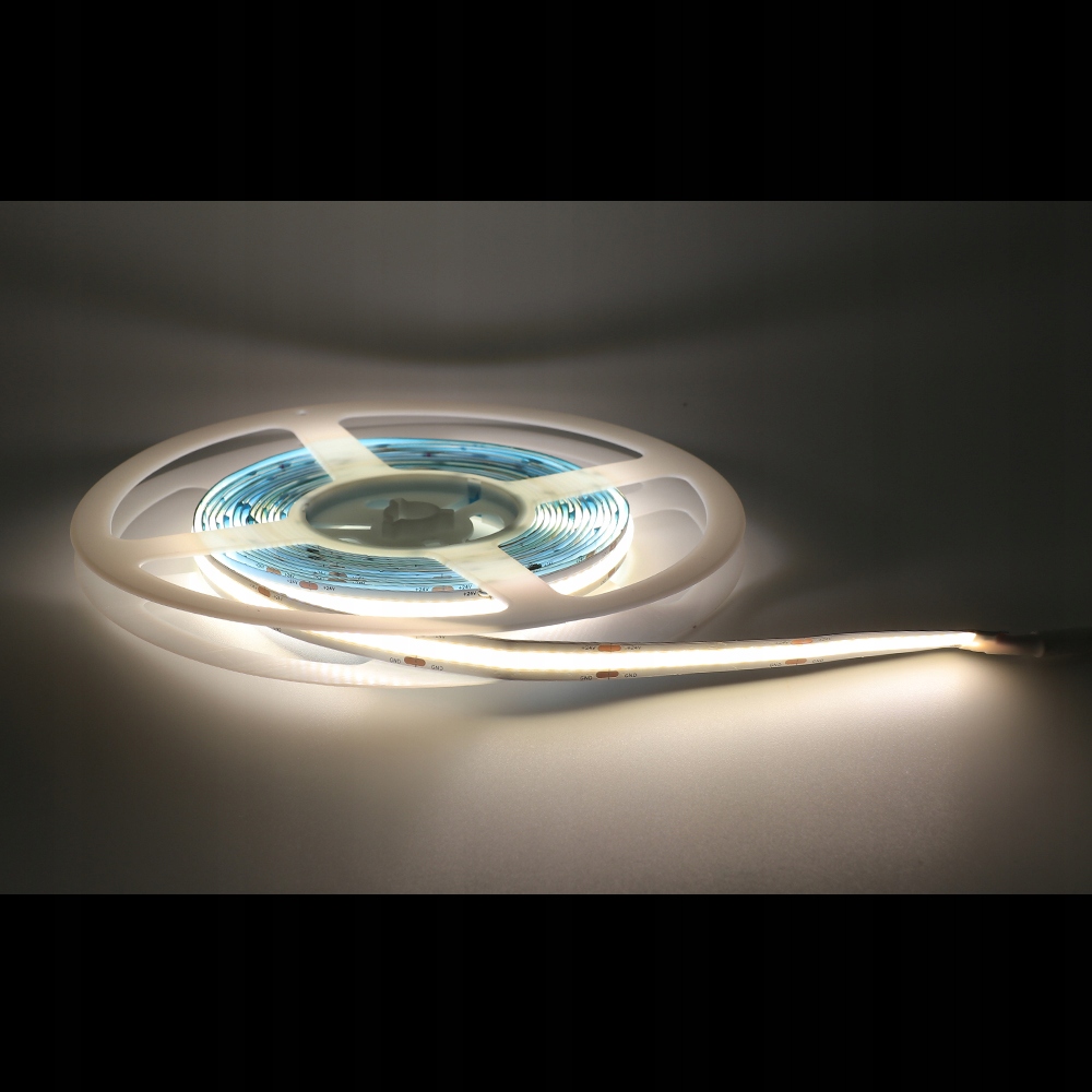Taśma LED COB to specjalistyczny pasek LED, który zapewnia niewiarygodnie gładkie światło, pozbawione poszczególnych punktów świetlnych. Wykorzystując taśmę LED COB, nie musisz stosować profilu z mlecznym kloszem, aby uzyskać jednolitą linię światła, bez pojedynczych punktów LED. Taśma LED COB charakteryzuje się elastycznością i wszechstronnym zastosowaniem. Będziemy mogli ją wykorzystać do oświetlenia wszelakiego rodzaju wnętrz, a wysoki współczynnik oddawania barw CRI>85 Ra połączony z niezwykłą wydajnością gwarantuje wysokiej jakości oświetlenie o naturalnym charakterze. Wykorzystując taśmy LED oparte na technologii diod COB, dzięki dużemu zagęszczeniu chipów na metrze uświadczymy efekt pełnej (jednolitej) linii świetlnej. Uciążliwe dla wielu posiadaczy LED-ów widoczne „punkty”, czyli diody LED SMD w taśmie nie będą już problemem.